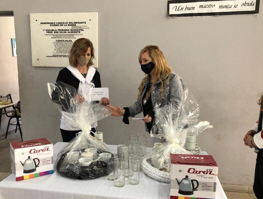 En representación de las maestras de la Escuela Primaria Municipal, este viernes recibió los obsequios la directora Karina Burgos, mientras que la rectora Felisa Suárez hizo lo propio para el personal del secundario.