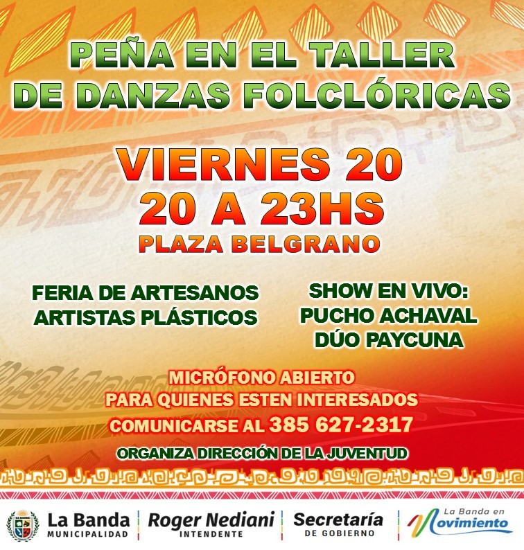 Para finalizar, se le recuerda al público que desee participar de la sexta edición del taller de danzas folclóricas, el mismos se desarrolla los días martes, miércoles y viernes desde las 20 en la plaza Belgrano, y el martes 31 se hará el cierre de las clases con una muestra artística.
