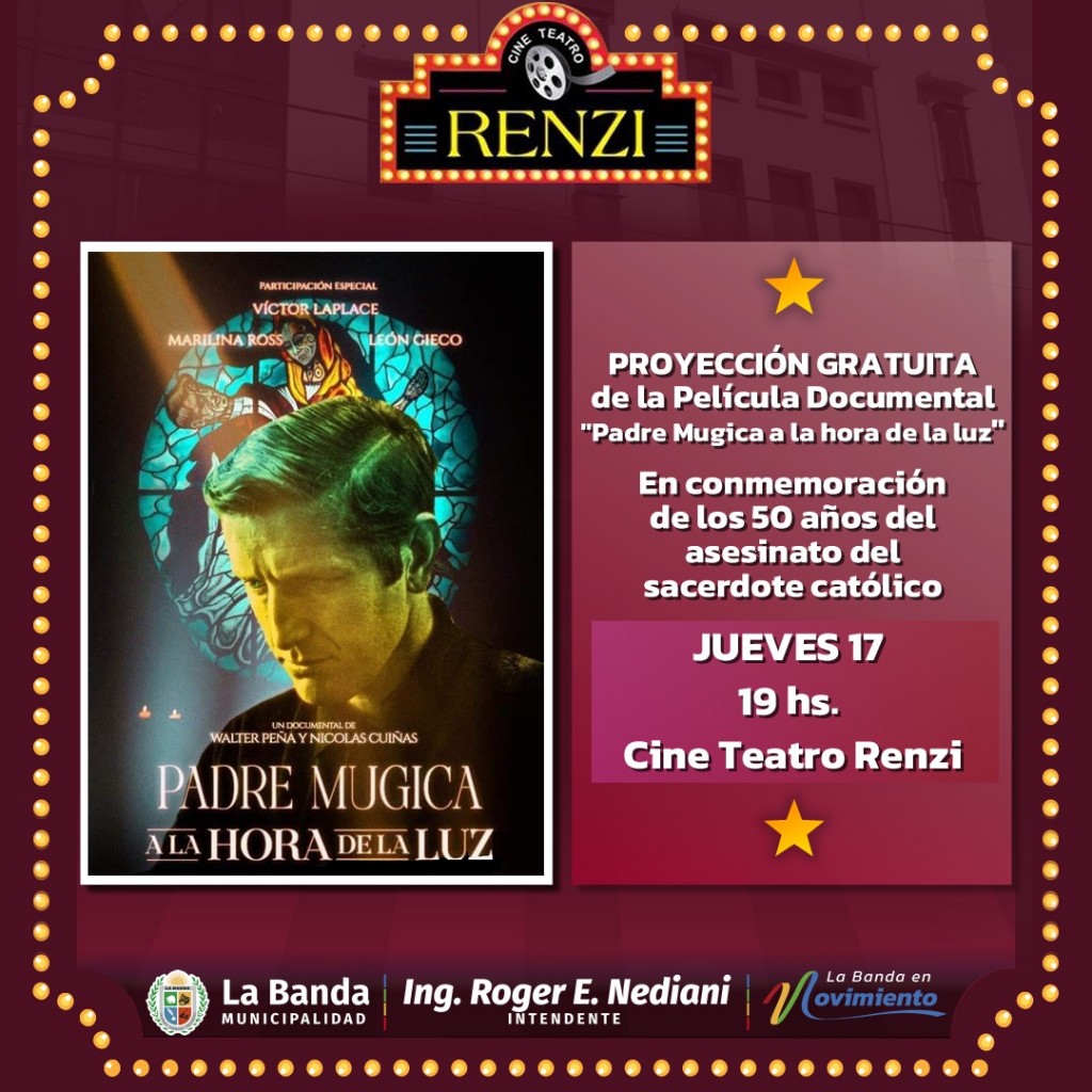 La Municipalidad de La Banda a través de la Secretaría de Comunicación invita el próximo jueves 17 a las 19, se realizará una proyección en el Cine Teatro Renzi de la película documental “Padre Mugica a la hora de la luz”, al conmemorarse 50 años del asesinato del sacerdote católico.