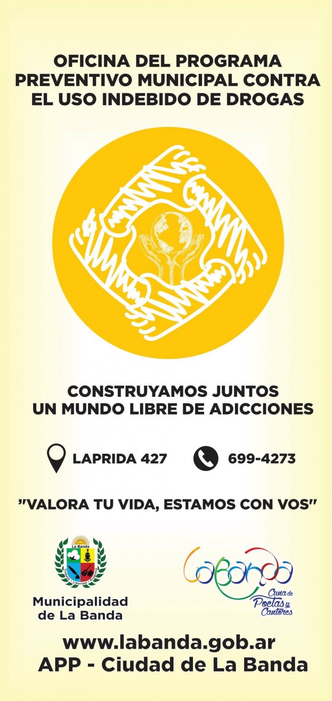 Este martes 26 de abril, desde las 10 en Laprida Nº 427, realizarán la presentación de la Oficina del Programa Preventivo Municipal Contra el Uso Indebido de Drogas, que dependerá de la Secretaría de Gobierno.