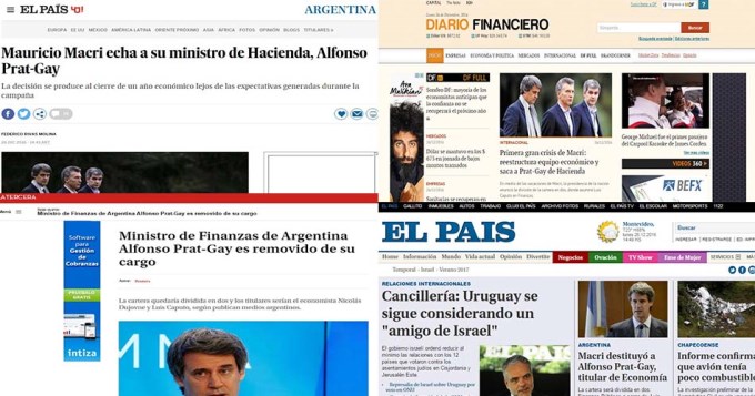“El ministro de Hacienda y Finanzas Públicas de Argentina, Alfonso Prat-Gay, encargado hasta ahora de todo el área económica del Gobierno, fue destituido de su cargo por el presidente Mauricio Macri”, reportó el diario uruguayo El País.
