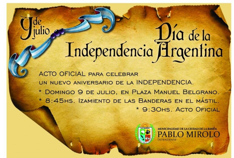 Con motivo de la conmemoración del 201º Aniversario de la Declaración de la Independencia Argentina, la Municipalidad de La Banda realizará el domingo 9 de julio por la mañana el acto central en la Plaza Manuel Belgrano.
