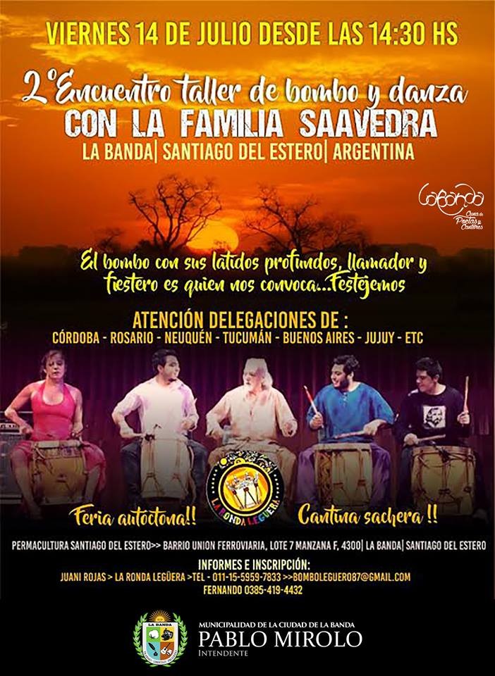 Con el objetivo de promover las diferentes manifestaciones culturales, la Municipalidad de La Banda auspicia el 2° Encuentro Taller de Bombo y Danza con la Familia Saavedra, que se realizará el viernes 14 a partir de las 14.30 en el Lote 7 Manzana F del barrio Unión Ferroviaria.