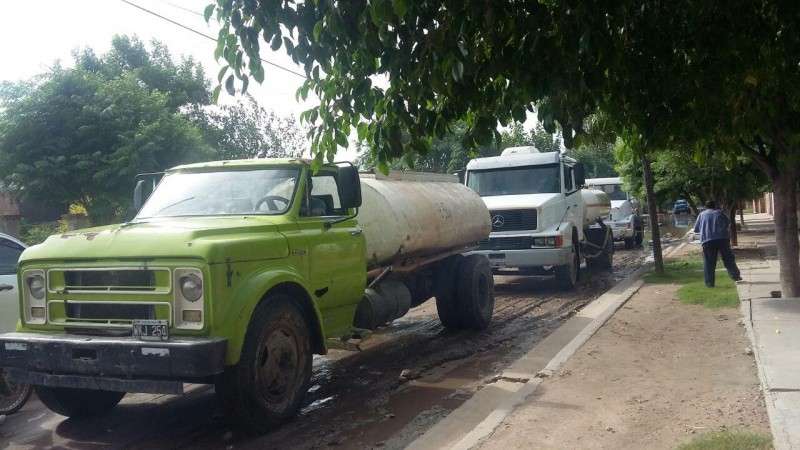 La flota de camiones cisterna de la Dirección de Riego trabajó desde las primeras horas de la mañana en los puntos donde hubo anegamientos de calles, sobre todo en zonas bajas donde la acumulación de agua es abundante y el drenaje de las calles se hace más difícil.