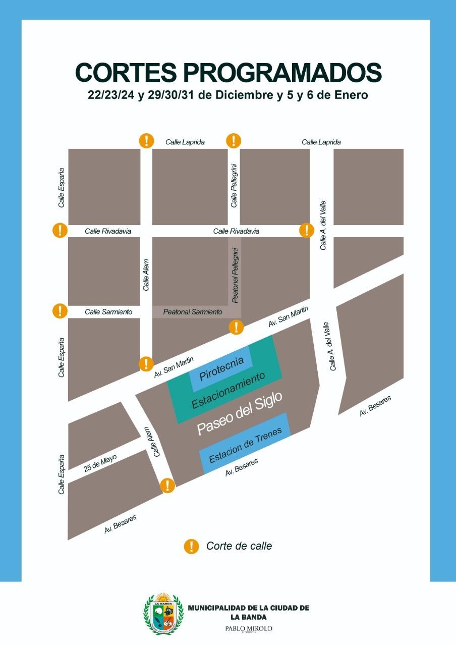 En cuanto a los cortes de calles, se recuerda que los días 22, 23, 24, 29, 30 y 31 de diciembre, como también el 5 y 6 de enero (fin de semana de Reyes Magos) se interrumpirá el tránsito de vehículos en las siguientes intersecciones: Alem y San Martín, Sarmiento y España, Rivadavia y España, Alem y Laprida, Pellegrini y Laprida, San Martín y Pellegrini, Aristóbulo del Valle y Rivadavia y Besares y Alem.