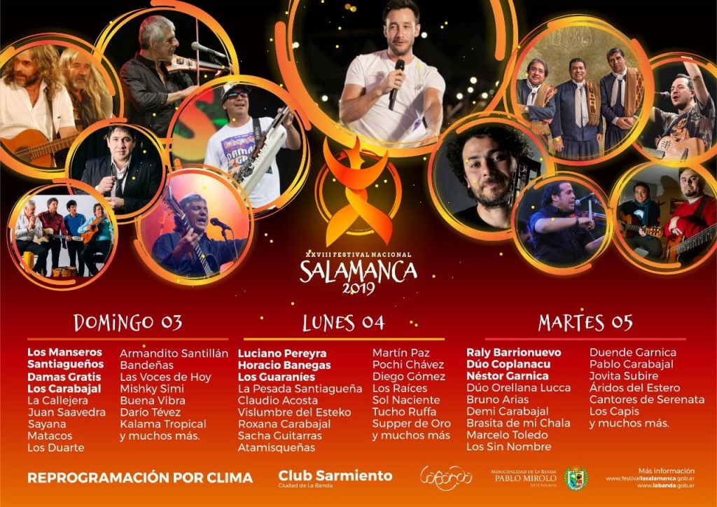 Tras el temporal que afectó a la provincia, éste domingo 3 vuelve a encenderse el fuego de la 28ª edición del Festival Nacional de La Salamanca, que tendrá lugar en el Estadio Ciudad de La Banda del Club Atlético Sarmiento, con la presencia de la danza, la música, artistas consagrados y nuevos talentos.
