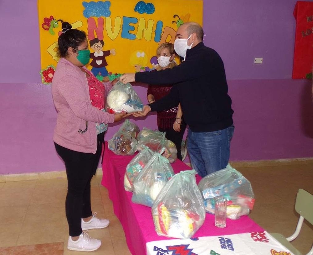 El jefe comunal estuvo acompañado por la subsecretaria de Educación y Cultura, Stella Maris Mirolo, con quien realizó la entrega de leche,  fideos, arroz, puré de tomate, avena, fideos, azúcar, cacao y flan.