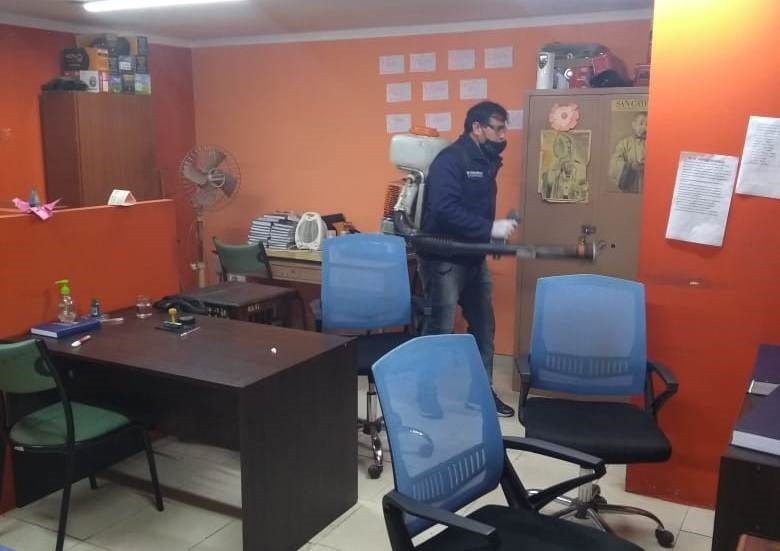 Durante la mañana del lunes, personal de la Secretaría de Servicios Públicos realizó la desinfección y sanitización en las oficinas municipales como medida preventiva para impedir el avance del virus Covid-19.