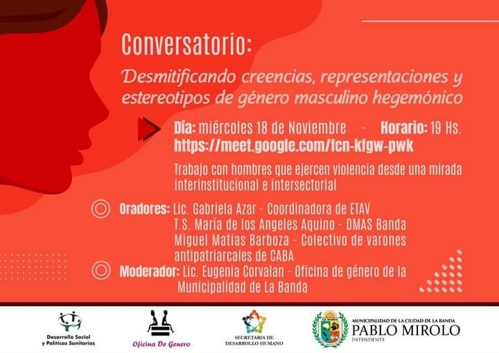 Este miércoles 18 de noviembre, a las 19, tendrá lugar un importante conversatorio virtual a través de la plataforma Google Meet, donde participarán como oradores la Lic. Gabriela Azar, coordinadora del Equipo Técnico de Asistencia a la Violencia (Etav) del Poder Judicial de la Provincia; también María de los Ángeles Aquino, referente de la Oficina de Medidas Alternativas y Sustitutivas (Omas) del Centro Judicial Banda, y Matías Barboza del Colectivo de Varones Antipatrialcales de la Ciudad Autónoma de Buenos Aires.