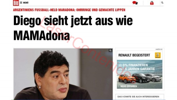 A sus 54 años, Diego Armando Maradona retornó a su programa de televisión 'De Zurda' el último fin de semana, donde tuvo, entre otras cosas, una entrevista exclusiva con Pablo Aimar, luego de su operación. Pero más allá de la repercusión lógica que genera cada paso del astro, en un punto del planeta decidieron puntualizar más en situaciones lejanas al contenido del programa para intentar ridiculizarlo.   Algunos meses atrás, se conoció una foto del "Diez", donde se lo podía ver con un renovado aspecto físico. Si bien él no lo confirmó, los rumores indicaron que se realizó una cirugía estética para mejorar algunos sitios de su cuerpo con los que no estaba contento, especialmente en su rostro.         Aquella noticia fue recordada por el diario alemán 'Bild', pero para intentar poner en un lugar grotesco al jugador que levantó la Copa del Mundo en la Final de 1986 en sus caras y al que vencieron en 1990 con un polémico penal. Con una foto en la que no se especifica si es trucada o no, se pone la lupa sobre un extraño tono en el color de los labios y en los ya clásicos aritos llamativos del ex futbolista.       Aprovechando eso, se burlaron de Diego y armaron una nota hablando sobre esa situación, titulada "Diego ahora parece 'Mamadona'". Allí señalan que quien lo había convencido para ese cambio es su novia actual y mencionan, una y otra vez, sus "labios gruesos". ¿Habrá quedado algún resquemor por el 86?