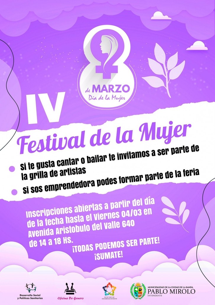 La Dirección de Desarrollo Social, a través de la Oficina de Género de la Municipalidad de La Banda realizará el Festival de la Mujer en conmemoración al Día Internacional de la Mujer.