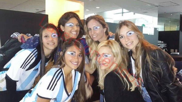 Claro que la extenista no está sola. Ese mensaje en la red social de los 140 caracteres estuvo acompañado por una foto ingresando al estadio de San Pablo junto a, entre otras, la mujer de Lionel Messi, Antonella Roccuzzo, la de Martín Demichelis, Evangelina Anderson, y la de Maxi Rodríguez, Gabi Plano. Todas lookeadas para la ocasión, con camisetas argentinas y maquillaje celeste y blanco.