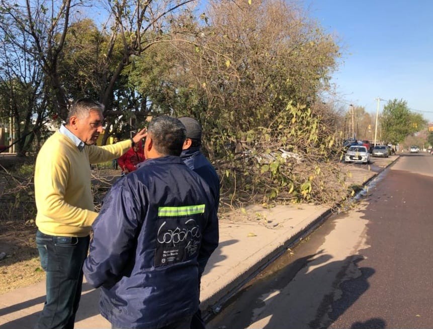 El jefe comunal estuvo acompañado por el equipo de la Dirección de Parques y Paseos dependiente de la Secretaría de Servicios Públicos, encargado de ejecutar el proceso de raleo y limpieza de los ejemplares arbóreos ubicados en espacios públicos de la ciudad.