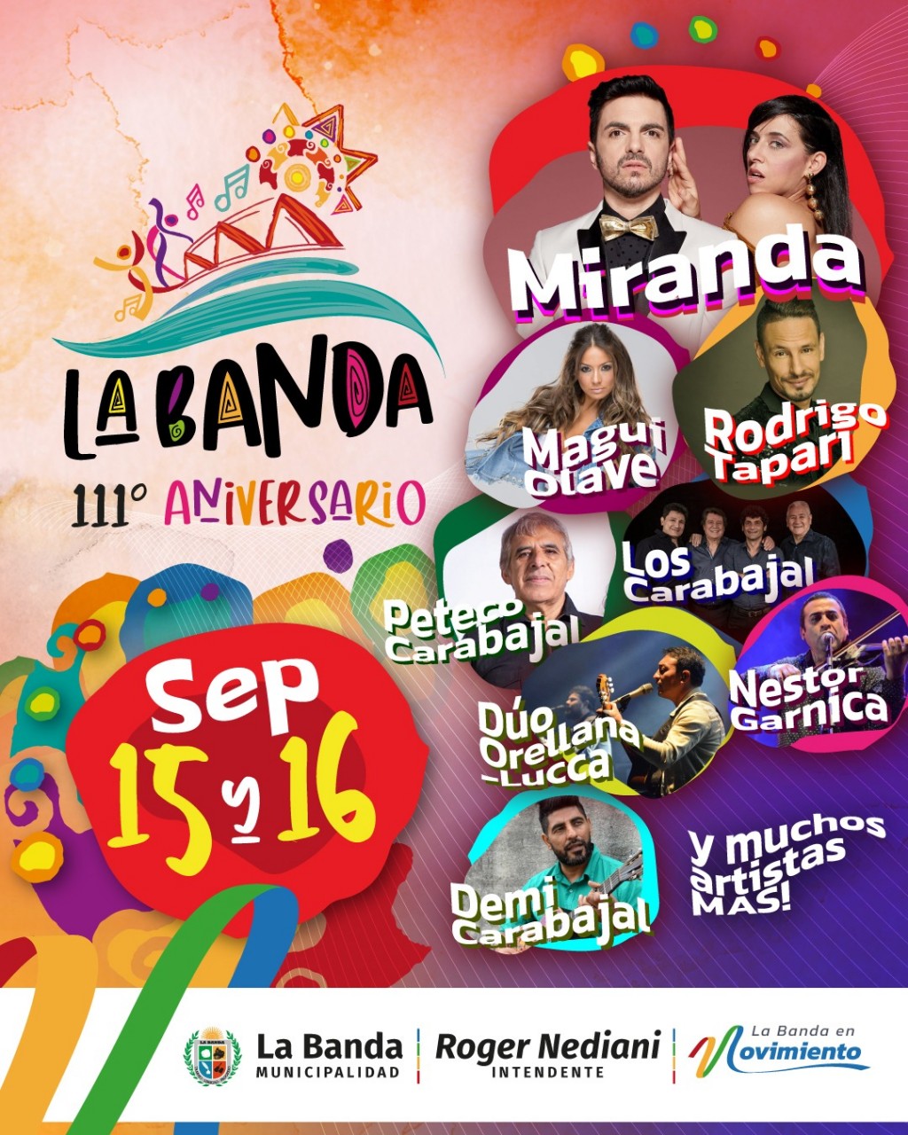 La Municipalidad de La Banda informó que el festejo por el 111° aniversario de la ciudad se realizará en dos veladas que contarán con las presentaciones de: Miranda!, Rodrigo Tapari, Magui Olave, Los Carabajal, Néstor Garnica, “Peteco” Carabajal, Dúo Orellana Lucca, “Demi” Carabajal, entre otros.