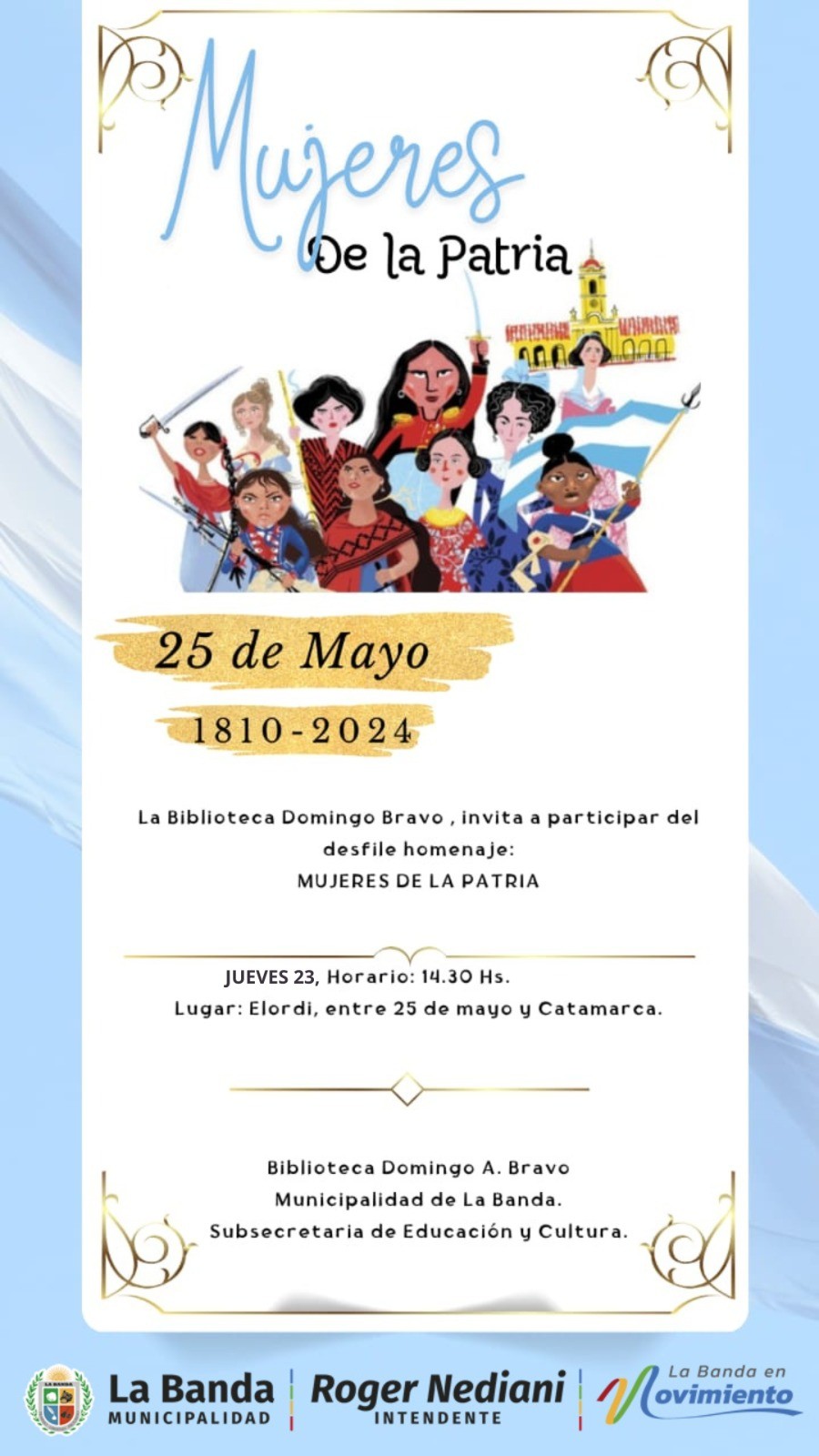La Municipalidad de La Banda, a través de la Subsecretaría de Educación y Cultura, en conjunto con la biblioteca Domingo Bravo, invita a todos los vecinos a participar del evento homenaje "Mujeres de la Patria", que se realizará el jueves 23 de mayo a partir de las 14.30 horas.