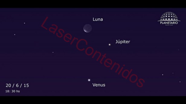 El "triángulo" celestial podrá observarse mañana al caer la tarde. "La Luna en fina fase creciente, Júpiter (mag -1.8) y Venus (mag -4.6) se ubicarán a mediana altura (alrededor de 30º) sobre el horizonte del noroeste. Hacia las 18:30 hs, el compacto astronómico, con el azulado cielo crepuscular de fondo, será una vista verdaderamente e inolvidable", precisó el Planetario Galileo Galilei en su web.