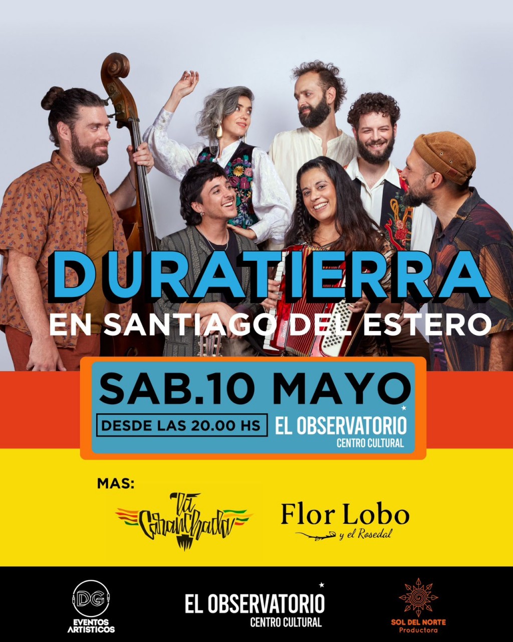 Duratierra, es una banda que despliega sonidos desde el rock, el pop, el jazz y el folklore tradicional. Aborda los géneros latinoamericanos con frescura y sin fronteras, respetando las raíces y encontrando en ellas el punto de partida para contar la propia historia en tiempo presente. Duratierra es una de las bandas argentinas más significativas de la música latinoamericana en la actualidad y el próximo Sábado 10 los acompañarán La Caranchada y Flor Lobo.