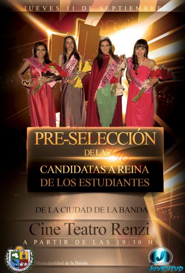 Desde la Dirección de la Juventud informaron que en el Jueves 11 de Septiembre realizará en la sala del Cine Teatro Municipal Renzi, desde las 19.30 horas la Pre-Selección de las Candidatas a Reina de los estudiantes y de la Ciudad de La Banda.