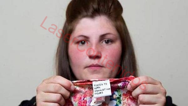 Rebecca Gallagher se quedó helada cuando descubrió en la etiqueta de un vestido, que había conseguido a precio de ganga por 10 libras en un local de ropa, un pedido de auxilio: "Forzados a trabajar durante horas exhaustas", reveló el diario South West Evening Post.
