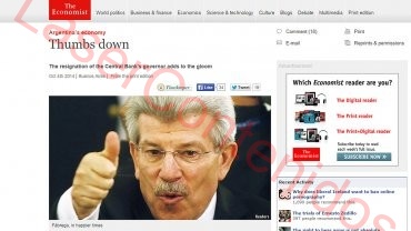 En una nota titulada "Pulgares abajo", la prestigiosa publicación británica analiza la salida del presidente del Banco Central. También sugiere que un acuerdo del Gobierno con los holdouts hubiera atenuado la crisis de reservas de la entidad