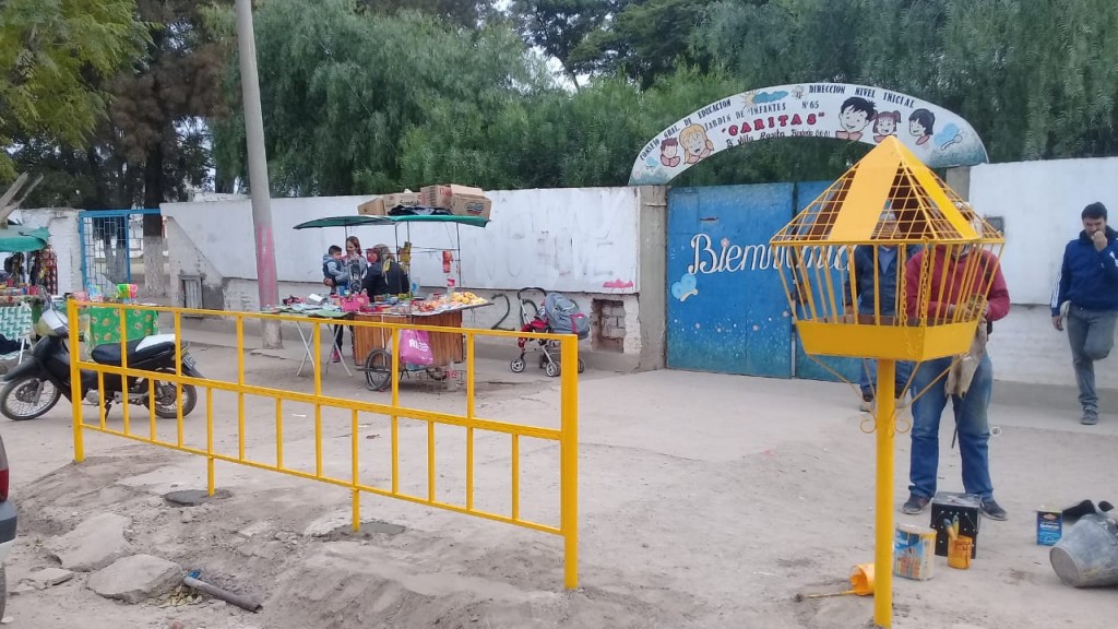 Con el objetivo de evitar el contacto directo de los niños hacia la calle, se colocaron las vallas de contención, que se ubican frente al perímetro que abarca la entrada del establecimiento escolar en el límite entre la vereda y la calle.