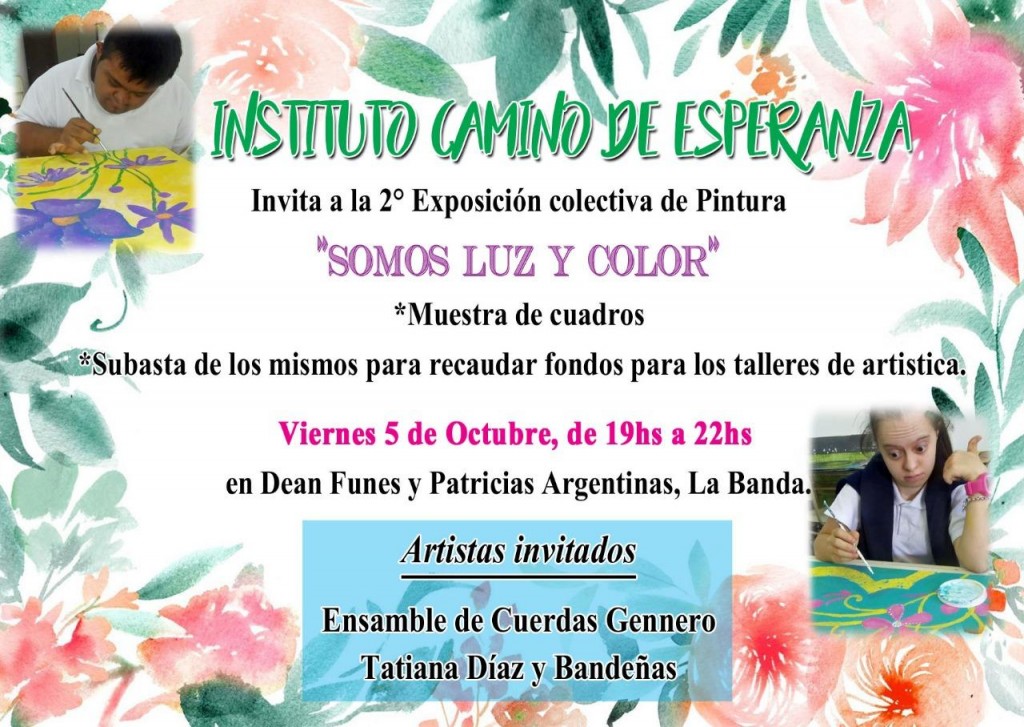 El Instituto Camino de Esperanza (Asaim), llevará a cabo la 2° muestra exposición colectiva de pintura denominada “Somos luz y color”, este viernes 5 de octubre de 19 a 22 en el edificio escolar de calle Deán Funes y Patricias Argentinas, con el acompañamiento de la Municipalidad de La Banda.
