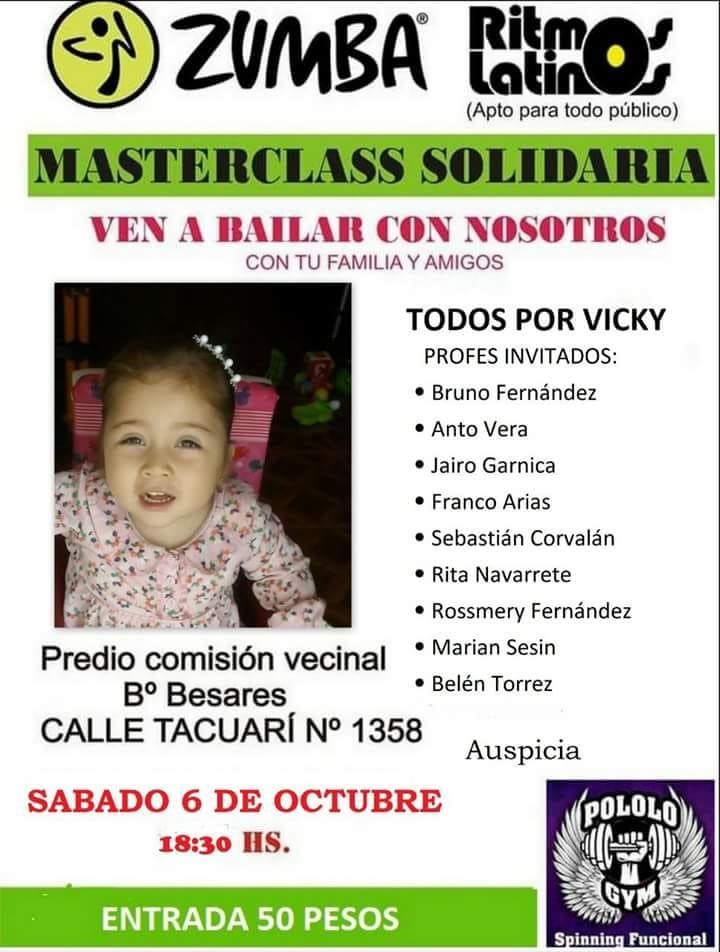Este sábado 6, se realizará la masterclass solidaria de zumba y ritmos latinos denominada “Todos por Vicky”, en el predio comisión vecinal ubicado en calle Tacuarí N° 1358 del barrio Besares, a partir de las 18.30, con el auspicio y acompañamiento de la Municipalidad de La Banda.