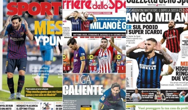 El lunes europeo amaneció con primeras planas vestidas de celeste y blanco. El rutinario gol de Messi en el empate con Valencia (también mojó� Garay), los dobletes de Icardi e Higuaín para las victorias de� Inter y Milán, y el tanto de Angelito Correa para el 1-0 del Atlético de Madrid. Pasá y mirá las portadas.