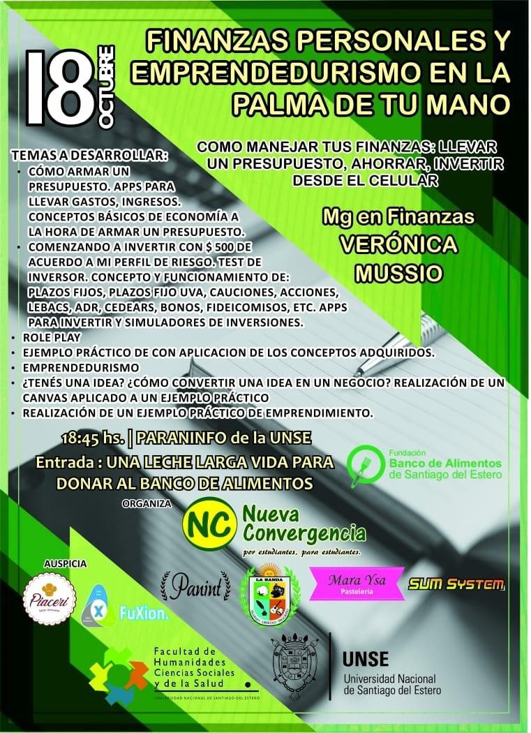La Municipalidad de La Banda acompaña e invita a participar de la jornada de "Finanzas personales y emprendedurismo en la palma de tu mano", que se llevará a cabo el día 18 de octubre a las 18:45 en las instalaciones del Paraninfo de la Universidad Nacional de Santiago del Estero.